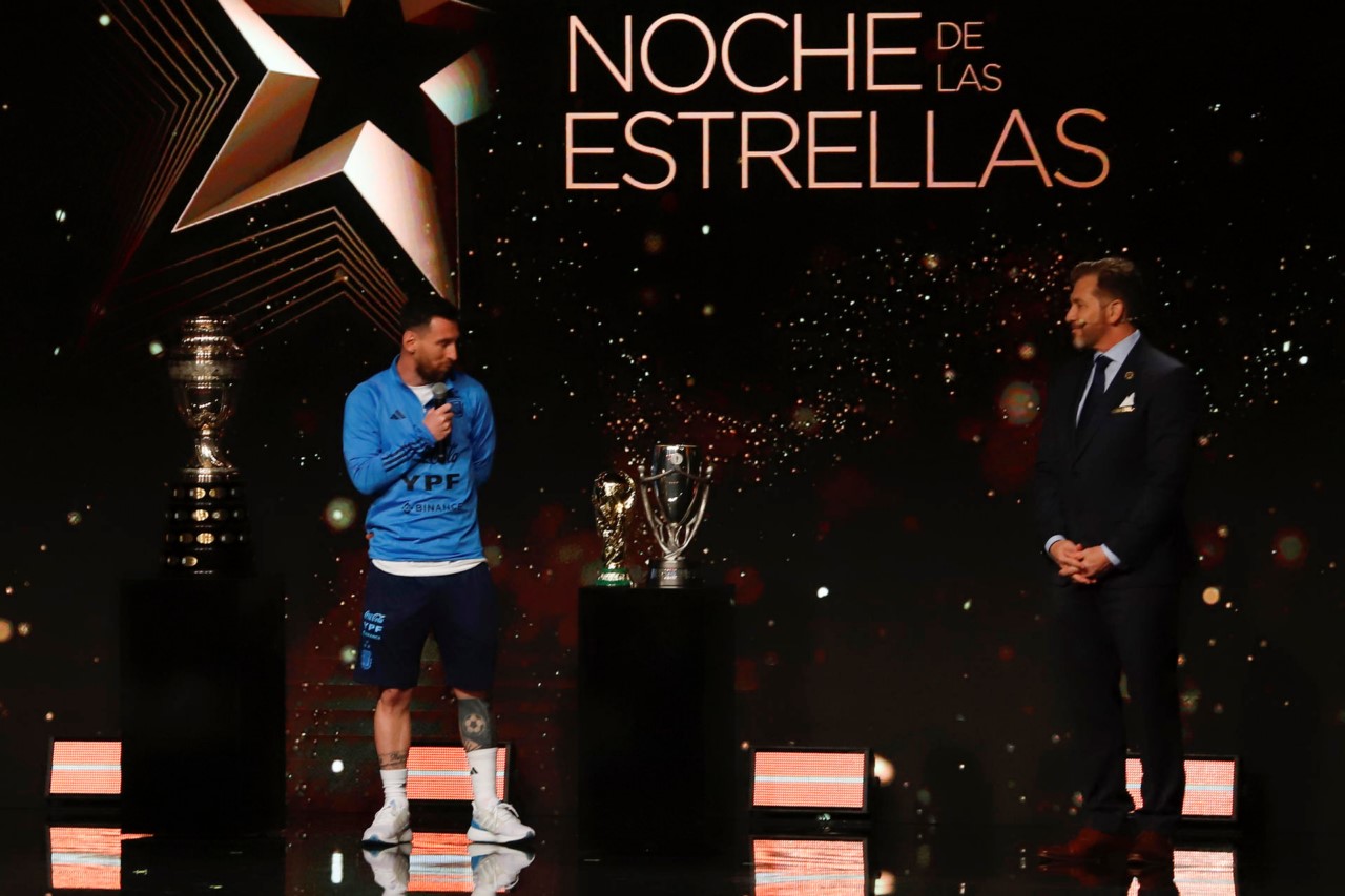 Lionel Messi (i) de Argentina habla junto al presidente de la Conmebol Alejandro Domínguez este 27 de marzo de 2023, durante La noche de las Estrellas de Conmebol. EFE/ Fernando Franceschelli