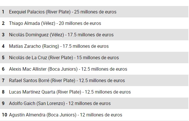 El portal Transfermarkt dio a conocer un listado en los 10 jugadores más caros que hay en Argentina, en el que el ex Deportivo Cali ocupa la séptima posición.