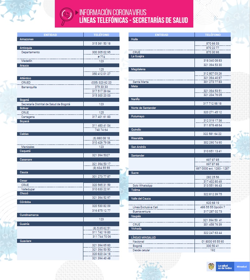 El Ministerio de Salud publicó las líneas de atención de las Secretarías de Salud a nivel nacional para comunicarse en caso de necesitar orientación sobre la COVID-19.