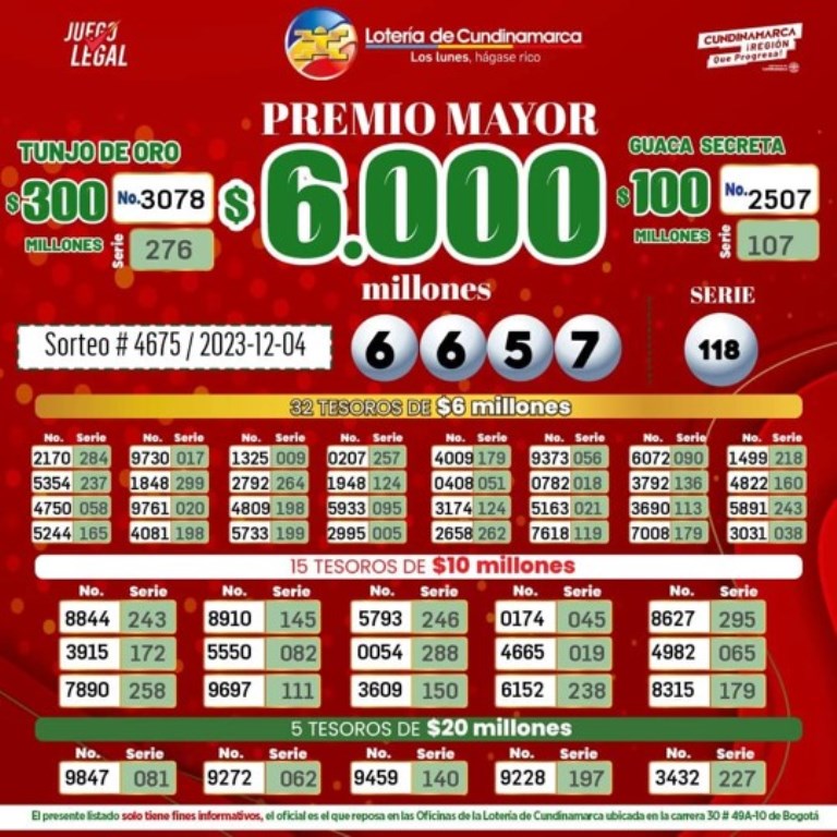 La Lotería de Cundinamarca, es una de las más destacadas de Colombia, El sorteos se realizará este lunes, 4 de diciembre de 2023 a las 11:00 p.m. Este emocionante evento, que captura la atención de miles de espectadores se transmite cada semana en directo por el canal regional y por las diferentes plataformas digitales de la entidad.