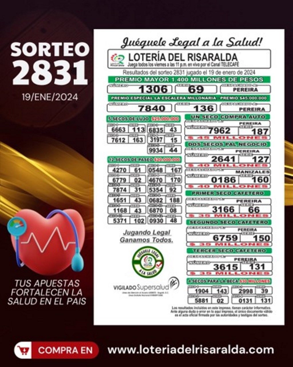Resultados del sorteo de la Lotería de Risaralda realizado el 19 de enero de 2024