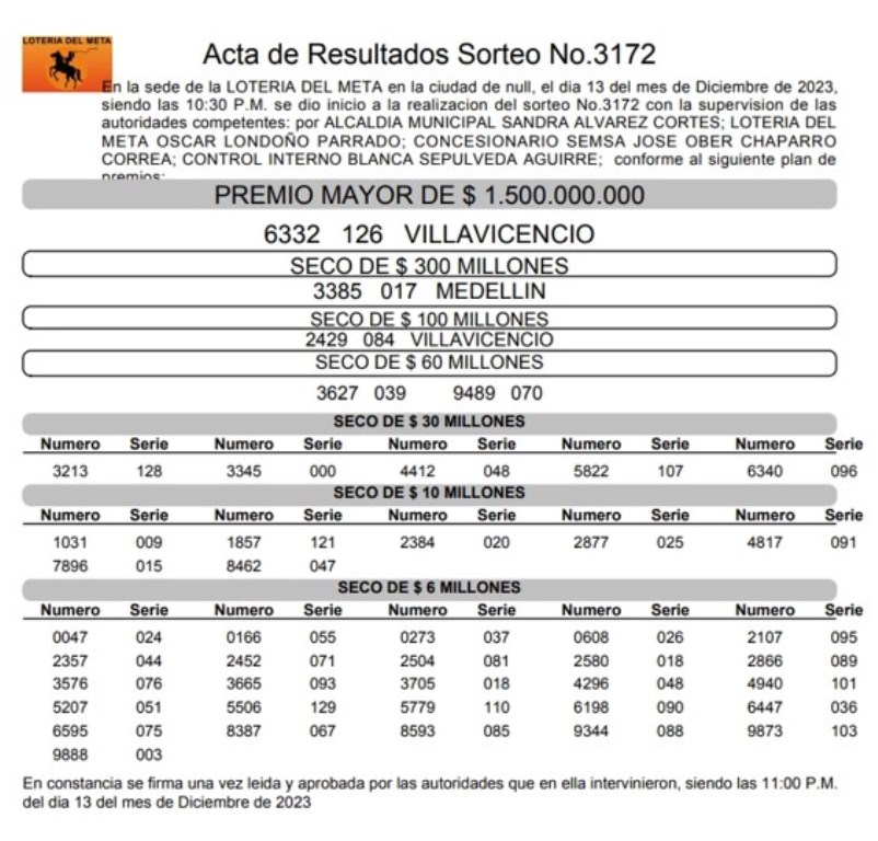 Resultados Lotería del Meta este miércoles, 13 de diciembre de 2023