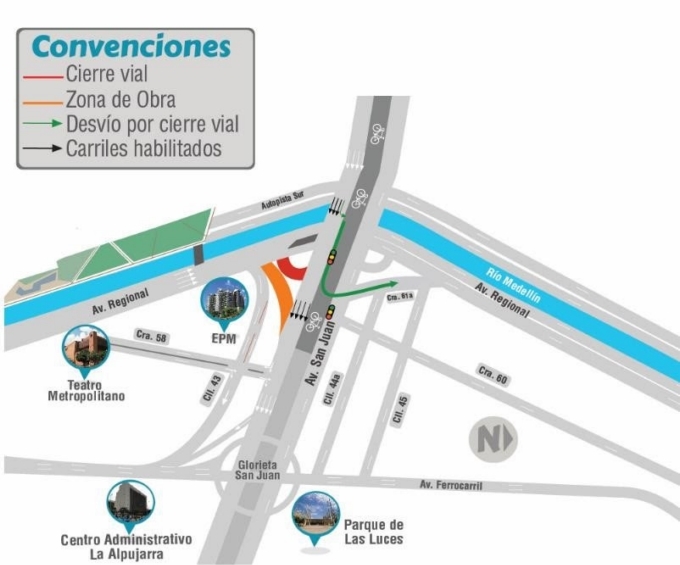 Quienes conducen por San Juan en sentido occidente – oriente, y requerían tomar la Av. Regional al norte, podrán girar a la izquierda en el nuevo cruce semafórico a la altura de la carrera 61 A. Con esta nueva medida, los conductores que transitan por San Juan, deberán mantenerse sobre el carril izquierdo para hacer el giro, no sobre el derecho como hasta ahora se ha venido haciendo.