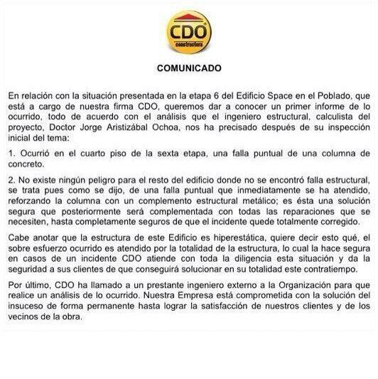 Minuto30.com .-La torre 6 del conjunto residencial Space colapsó el sábado 12 de octubre a las 8 y 20 de la noche, pese a que la Constructora CDO enviara el día antes un comunicado oficial descartando cualquier peligro en el lugar.