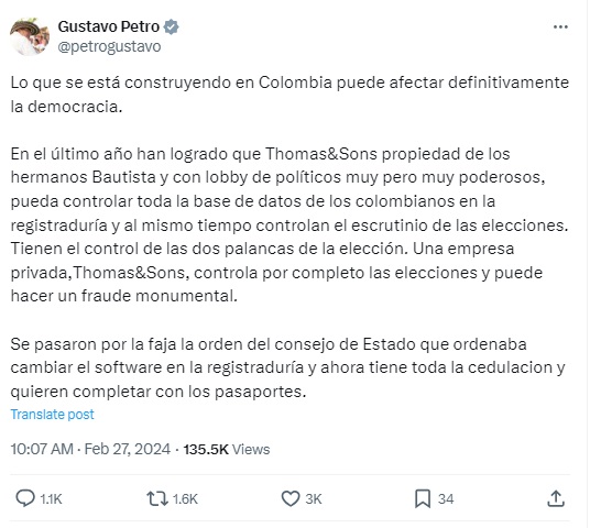 “En el último año han logrado que Thomas & Sons propiedad de los hermanos Bautista y con lobby de políticos muy pero muy poderosos, pueda controlar toda la base de datos de los colombianos en la registraduría y al mismo tiempo controlan el escrutinio de las elecciones. Tienen el control de las dos palancas de la elección”, dijo.