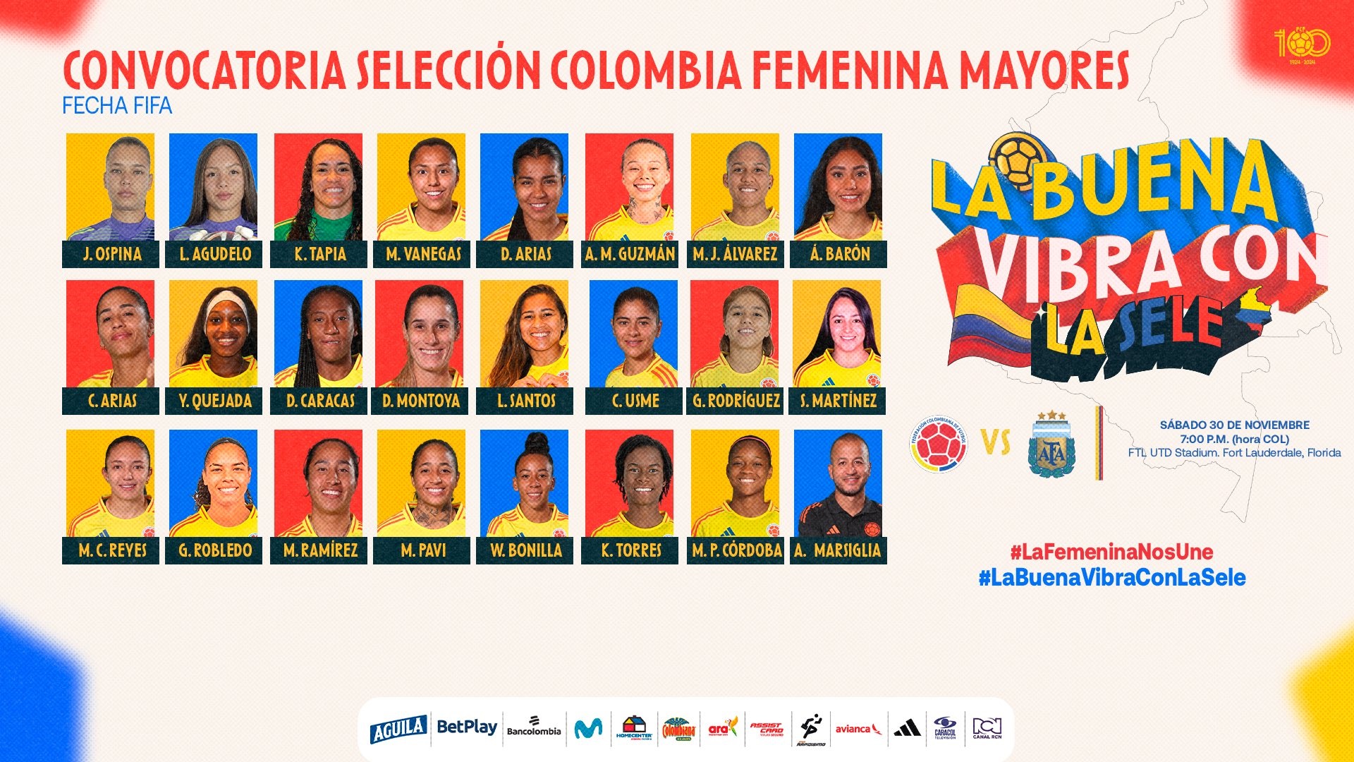 Marsiglia llamó igualmente a Catalina Usme, María Paula Córdoba, Mary José Álvarez, Mayra Ramírez, Sara Sofía Martínez, Wendy Bonilla y Yirleidis Quejada.