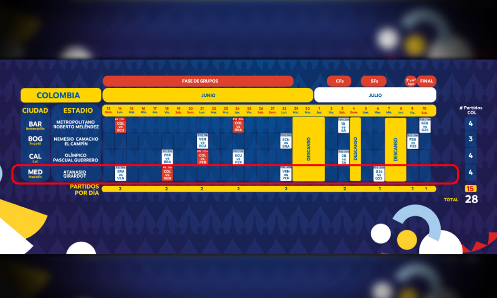 Colombia, por su parte, albergará la final el día 10 de julio. Las ciudades elegidas para ser sede de la Copa América son Barranquilla, Bogotá, Cali y Medellín.