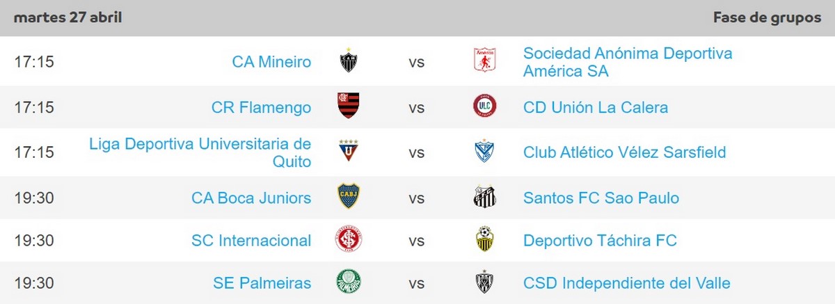 Boca Juniors recibirá a Santos; Internacional a Deportivo Táchira y Palmeiras a Independiente del Valle, que desde hace rato dejó de ser un invitado de piedra en la Copa Libertadores.