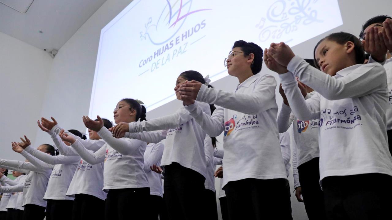 Se trata de un coro integrado por medio centenar de niños y niñas, formados en el Centro Filarmónico de La Paz, y que se presentó el 24 de noviembre de 2021 en la Plaza Bolívar con motivo del quinto aniversario del acuerdo de paz, pero que hoy ha visto su lanzamiento oficial en la sede de “Fragmentos”, un monumento hecho por la artista Doris Salcedo con el metal de los fusiles que dejaron las FARC tras su desmovilización.