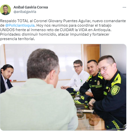 En Twitter anunció, “respaldo total al Coronel Giovany Puentes Aguilar, nuevo comandante de la Policía de Antioquia. Hoy nos reunimos para coordinar el trabajo unidos frente al inmenso reto de cuidar la vida en Antioquia. Prioridades: disminuir el homicidio, atacar la impunidad y fortalecer la presencia territorial“.