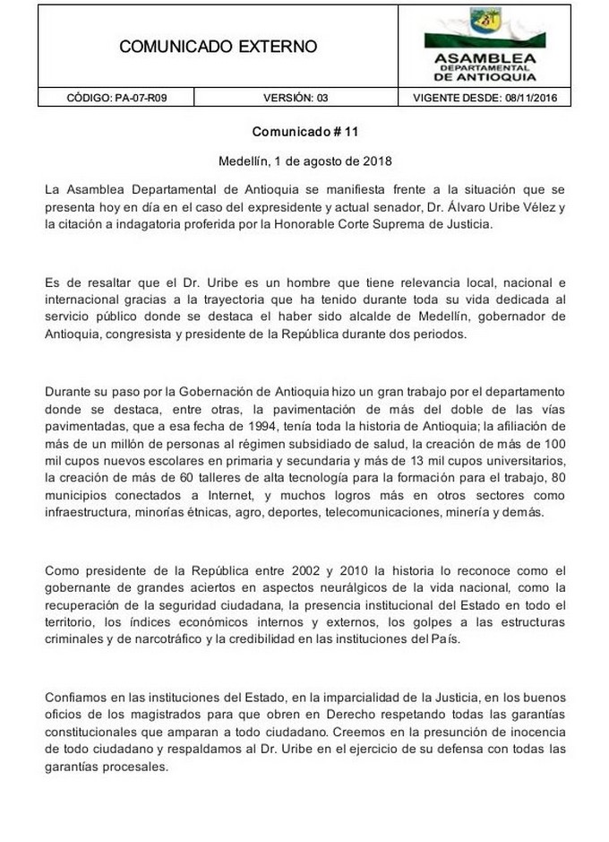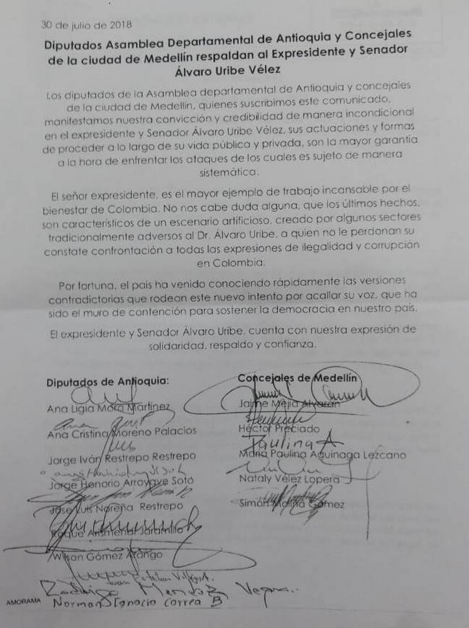 Los diputados de Antioquia, Concejales de Medellín y del Área Metropolitana, militantes del partido Centro Democrático y algunos de otros partidos, manifestaron públicamente su apoyo al expresidente y actual senador, Álvaro Uribe Vélez, de quien indicaron que es el mayor ejemplo de trabajo incansable por el bienestar de Colombia.