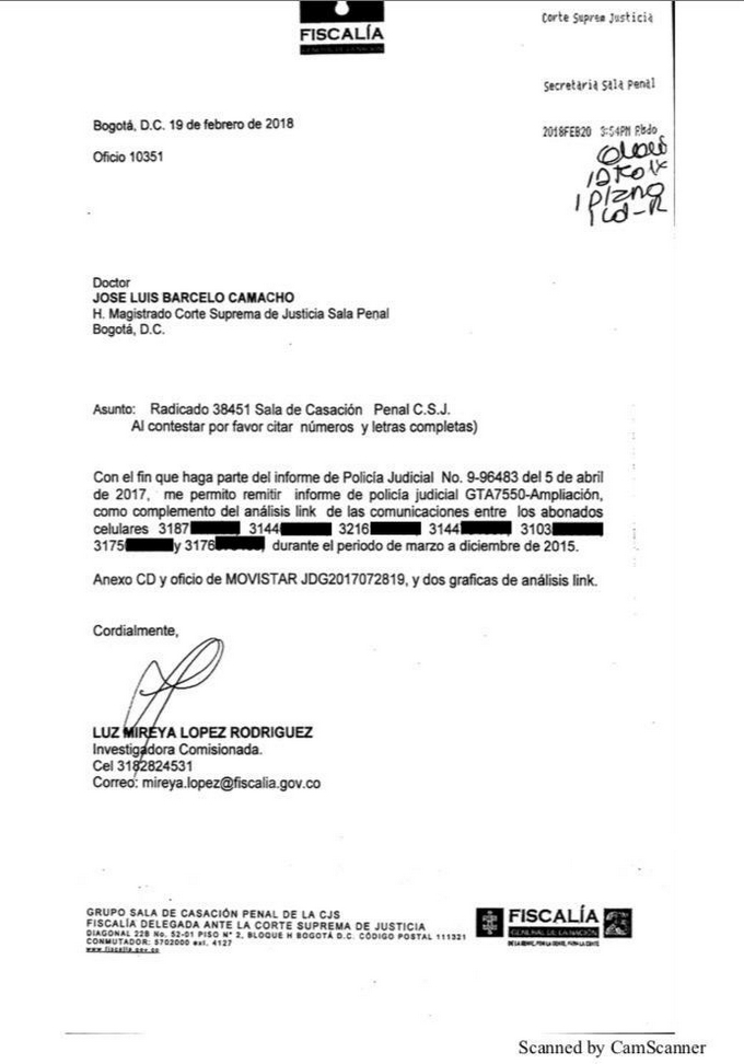 En la notificación dirigida a José Luis Barceló, magistrado de la Corte Suprema, se presentaron los análisis realizados por la Policía judicial a los números incluidos en la investigación, igualmente la compañía telefónica Movistar, encargada de estas líneas, identificó claramente a los titulares.