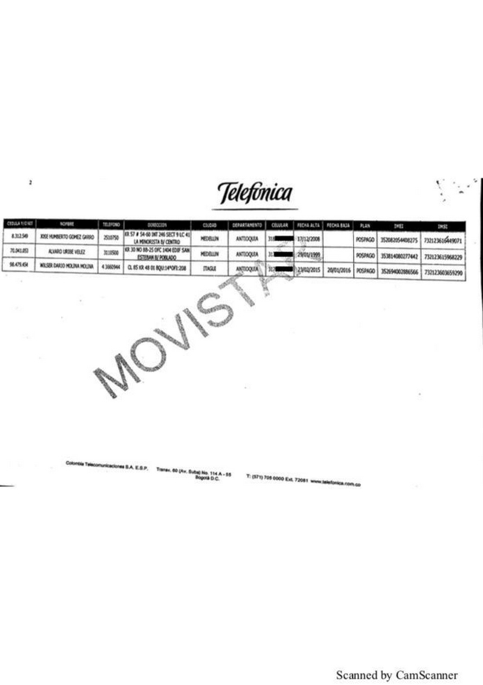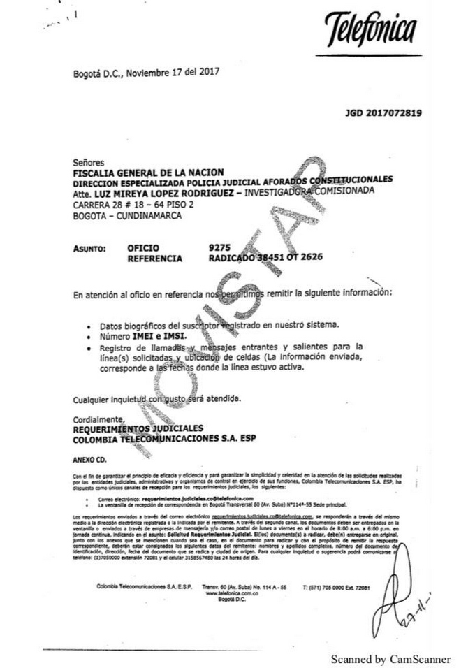 La compañía telefónica respondió a la solicitud de los investigadores el 17 de noviembre del 2017, donde se notifica que los dueños de dichos números son Álvaro Uribe Vélez, Wilser Darío Molina Molina y Humberto Gómez Garro.