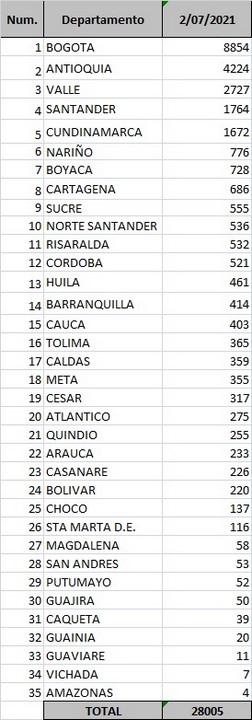 El Ministerio de Salud informó la cifra de personas contagiadas de Covid-19 en Colombia, y este viernes 02 de Julio se reportaron 28.005 nuevos contagiados, sin embargo, 29.577 personas le ganaron la batalla al virus.