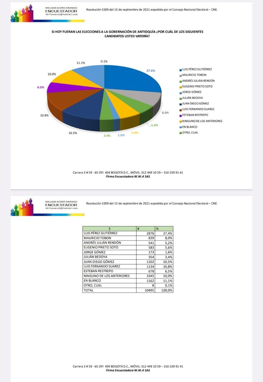 Una encuesta realizada por la firma William Acero Arangola y publicada por el periódico El Espectador, muestra cómo el candidato conservador Juan Diego Gómez Jiménez, ha ido creciendo en la intención de voto para la Gobernación de Antioquia.
