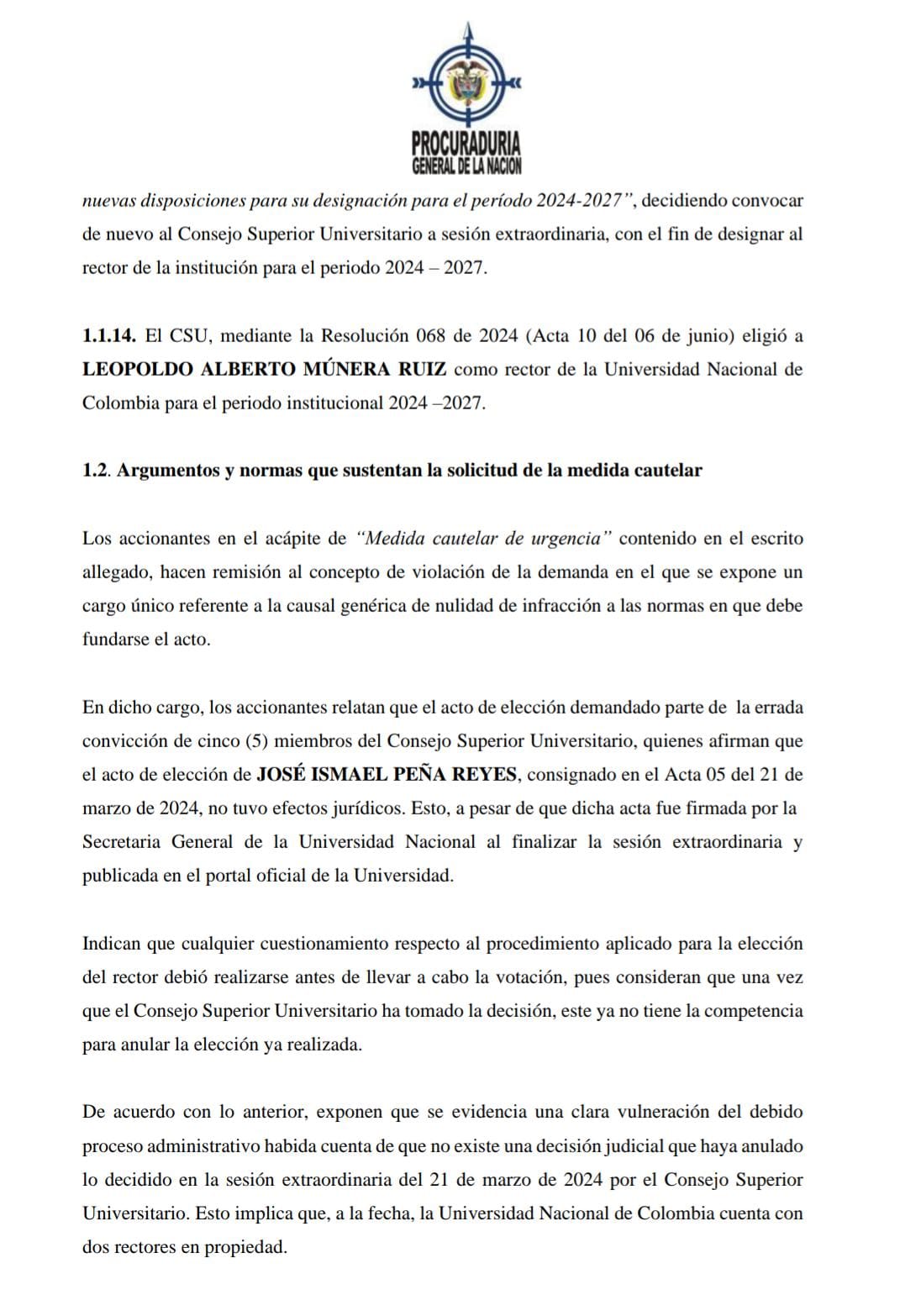 Resumen: La Procuraduría General de la Nación solicita al Consejo de Estado anular la elección de Leopoldo Munera como rector de la Universidad Nacional, argumentando infracciones al debido proceso. Esta controversia ha generado incertidumbre en la comunidad universitaria sobre el liderazgo administrativo de la institución.