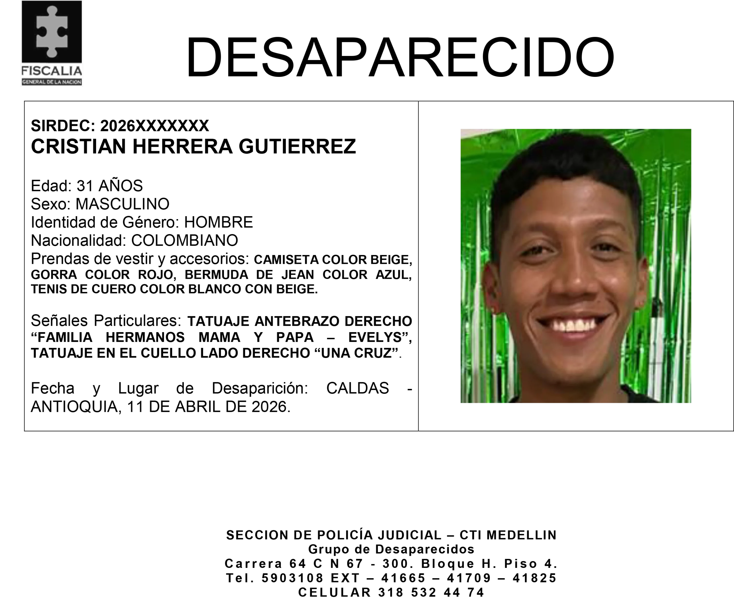Cristian Herrera Gutiérrez es un hombre colombiano de 31 años, identificado como masculino. Al momento de su desaparición vestía una camiseta color beige, gorra roja, bermuda de jean azul y tenis de cuero en tonos blanco con beige.