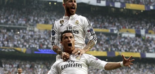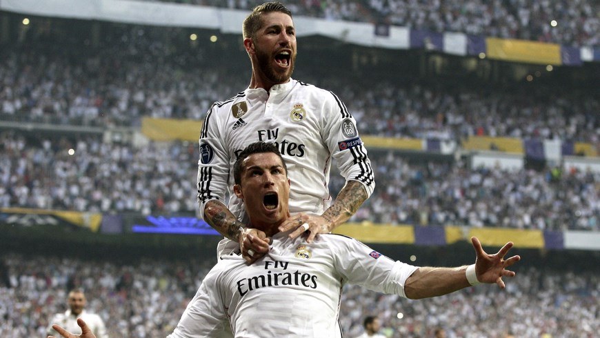 El delantero portugués del Real Madrid Cristiano Ronaldo (abajo) celebra con su compañero, el defensa Sergio Ramos (arriba), el primer gol de su equipo que ha marcado de penalti, durante el encuentro frente a la Juventus de Turin de vuelta de la semifinales de la Liga de Campeones que se jugó en el estadio Santiago Bernabéu, en Madrid. EFE