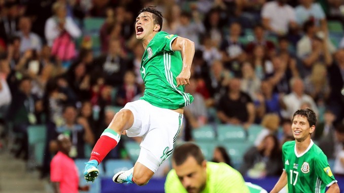 El mexicano Raul Jimenez (i) celebra luego de anotar un gol durante un partido del grupo A de la Copa Confederaciones de la FIFA 2017 disputado entre México y Nueva Zelanda en el estadio Fisht de la ciudad de Sochi (Rusia). EFE