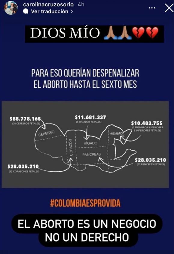 La presentadora ha sido fuertemente cuestionada en las últimas horas por dar su postura en contra del aborto. En las historias de su Instagram, Carolina Cruz publicó una imagen alusiva al aborto pero muchos usuarios de las redes sociales la criticaron por “desinformar” a sus seguidores.