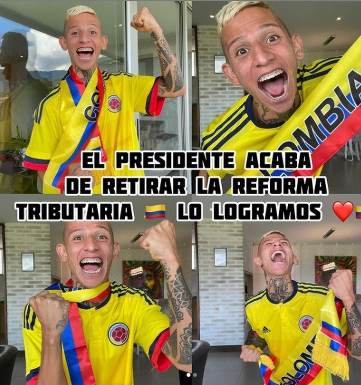 Después de que el presidente Iván Duque retiró la nueva reforma, La Liendra salió con camisa de Colombia y dijo: “¡Tumbamos la reforma tributaria, lo logramos! no me lo esperaba, qué emoción, que notición, no sé qué se viene pero aprovechemos el presente. ¡Estoy orgulloso de mi país porque lo logramos!”.