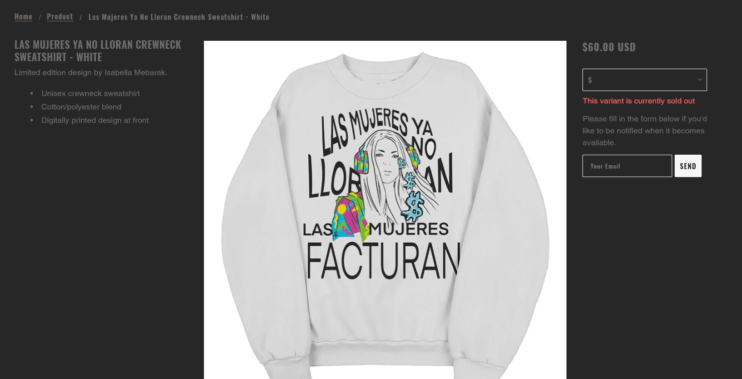 Ahora, creciendo más, y facturando más, la cantante sorprendió con un nuevo producto de su marca Shakira y ahora vende en su tienda una edición limitada de un espectacular buso, con esta icónica frase de su canción “Las mujeres no lloran, las mujeres facturan”.