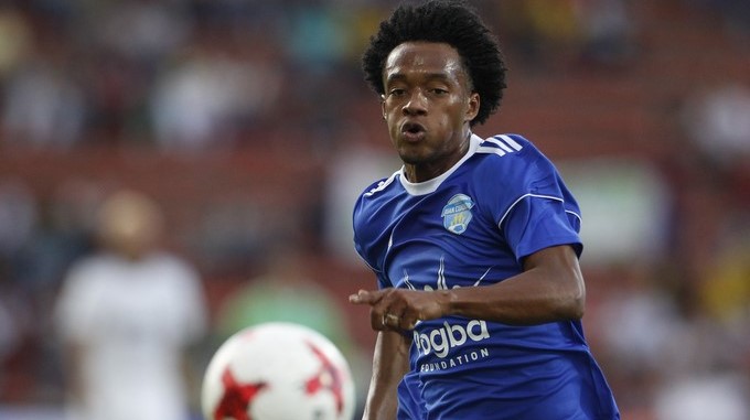 El jugador Juan Guillermo Cuadrado en acción durante un partido amistoso entre Amigos de Cuadrado vs Amigos de Pogba.