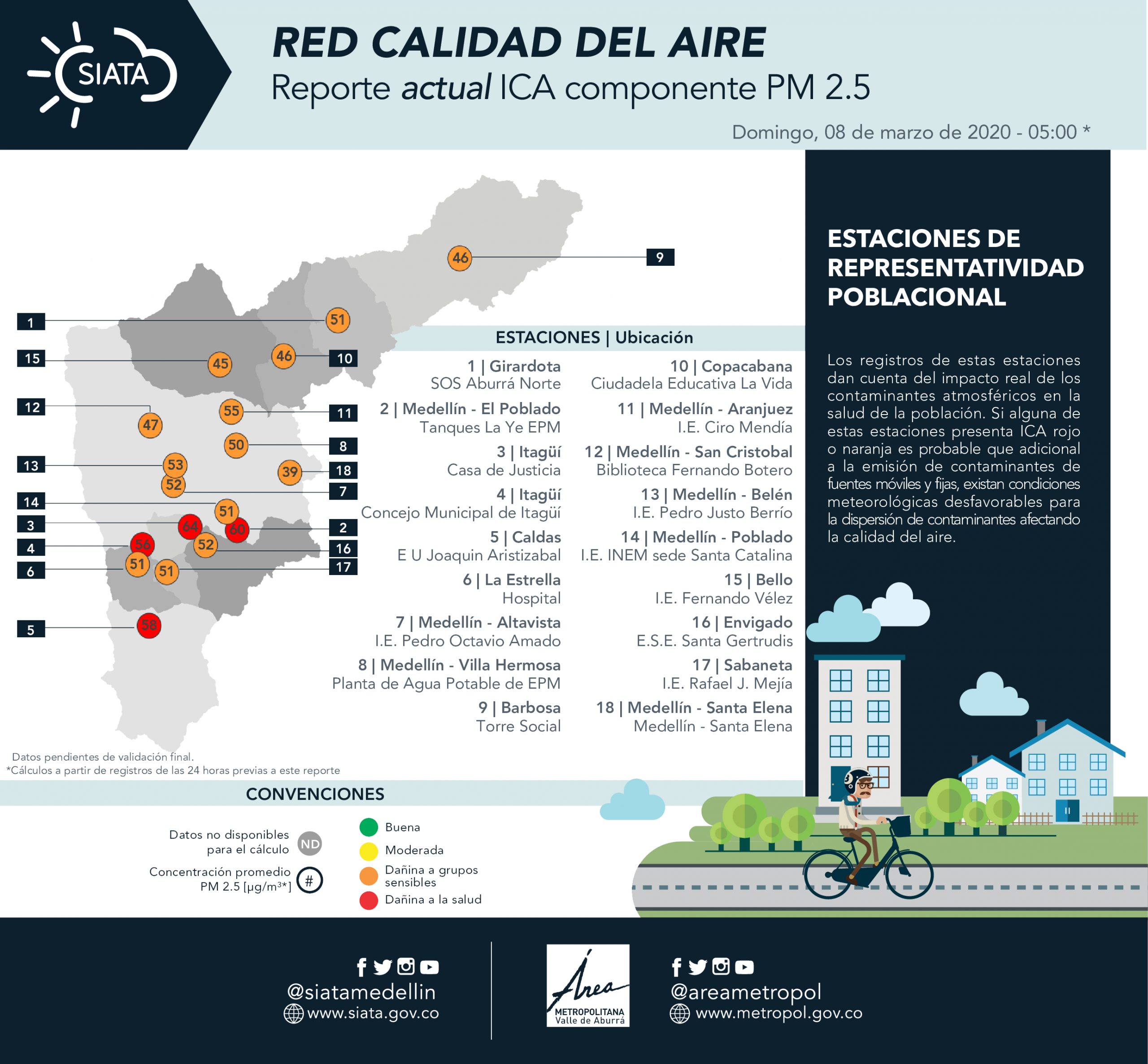 Dos estaciones de El Poblado, Itagüí y Caldas son las que presentan peores indicadores de calidad del aire, dos de ellas superando en más de 60 la concentración de partículas nocivas para la población. Estaciones como Bello, Copacabana, San Cristóbal y Santa Elena están en naranja, presentandose condiciones meteorológicas desfavorables para la dispersión de contaminantes.