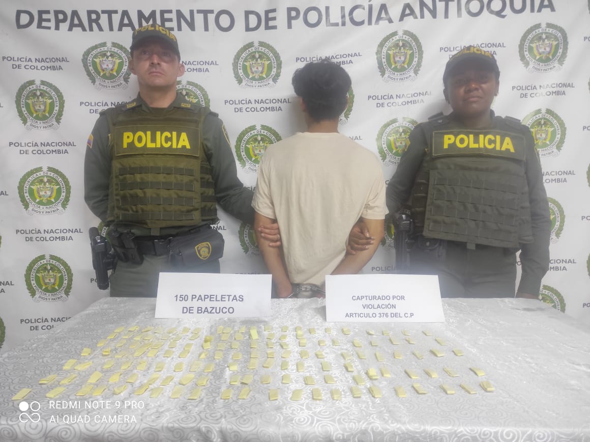 El primero hecho ocurrió en el municipio de Valparaíso, Suroeste antioqueño, en el sector El Cementerio, fue capturado un hombre de 22 años, a quien le incautaron 70 gramos de bazuco y 10 gramos de base de coca, por ello fue puesto a disposición de la Fiscalía Seccional 35 de Támesis.