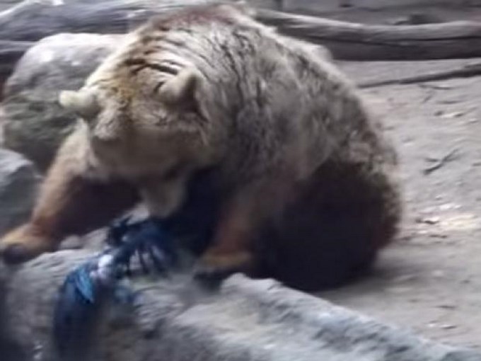En el video que fue grabado por unos visitantes del zoológico se ve como un cuervo bate desesperadamente sus alas tratando de salir del agua, el oso mira su estanque ve el ave allí pero no le presta atención y sigue en sus labores, intempestivamente va hasta el agua mete su garra y de un ala saca al asustado cuervo y lo pone en el suelo y se va a seguir con su almuerzo, el ave asustada se demora varios segundos en reaccionar, asustado y sorprendido se puso de patas e impávido mira al oso que continúa disfrutando de su ensalada de verduras.