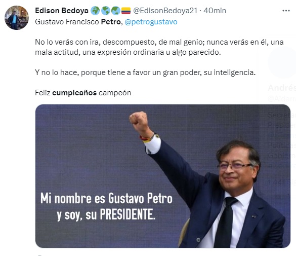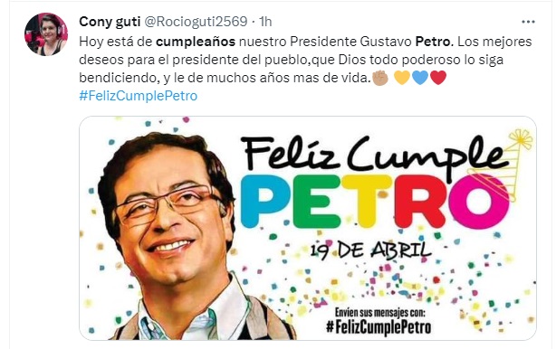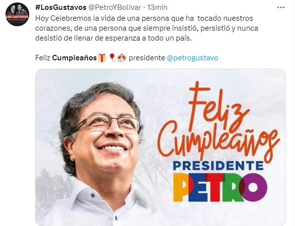 Así mismo, cientos de personas apenas comenzando este día, han aprovechado las redes sociales para expresarle afecto al presidente Petro en su cumpleaños y llenan el Twitter de algunos sentidos mensajes, donde dejan clara la admiración que le guardan por el trabajo que hace y desea hacer por el país.
