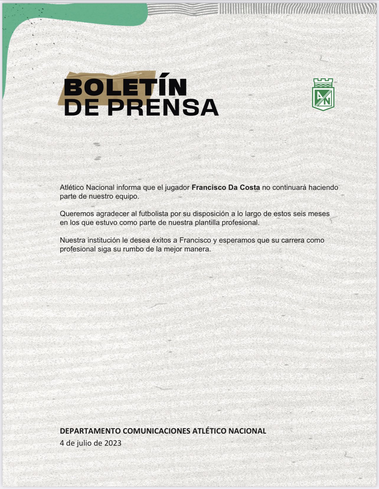 Atlético Nacional confirmó que el jugador brasileño Francisco Da Costa, no continuará haciendo parte del verde paisa.