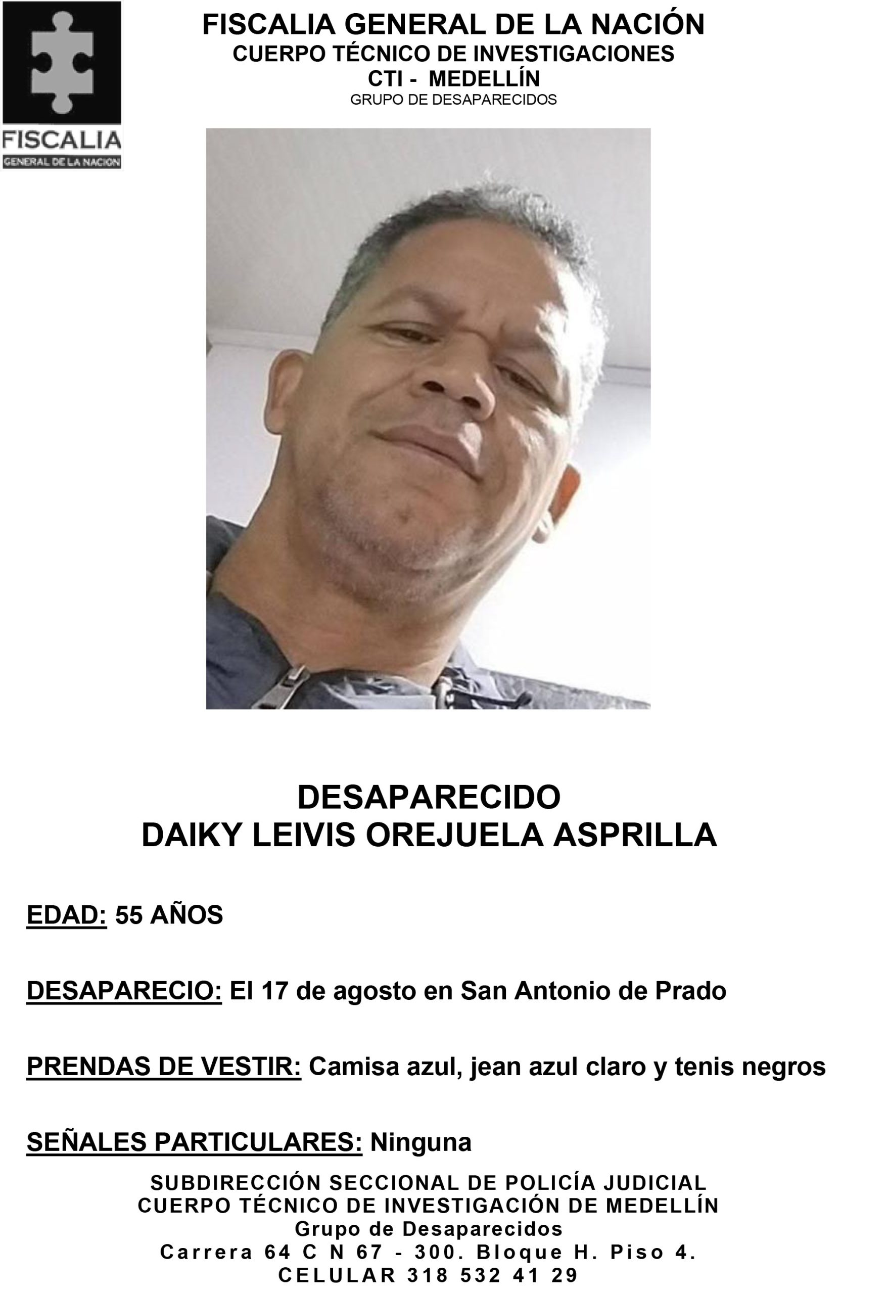 Daiky Leivis Orejuela Asprilla, de 55 años de edad, fue reportado como desaparecido el pasado 17 de agosto. La desaparición ocurrió en San Antonio de Prado, una zona del municipio de Medellín, Antioquia.