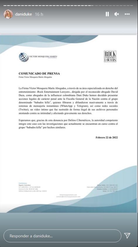 “La firma de abogados Víctor Mosquera Marín es la encargada de representar a la influenciadora Dani Duke en este proceso. “Hemos decidido presentar acciones legales de carácter penal ante la Fiscalía General de la Nación contra el grupo denominado ‘babados killa’, quienes filtraron y difundieron masivamente … un video íntimo que fue sustraído de forma ilegal de sus archivos personales”, se lee en el comunicado.
