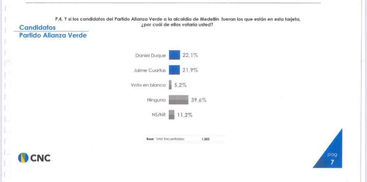 Luego de que los resultados de la encuesta realizada por el Partido Verde para elegir su candidato único reflejaran un empate técnico entre Jaime Cuartas y Daniel Duque, que obtuvieron un 21,9 % y 22,1 % respectivamente, es decir que la diferencia fue de tan solo 0,2 %, se conoció que la última palabra la tendrán los directivos departamentales de esta colectividad.