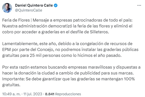 El Alcalde de Medellín, Daniel Quintero compartió hace pocos minutos en su cuenta de Twitter, un mensaje dirigido a empresas que deseen patrocinar graderías para el desfile de Silleteros, en la Feria de Flores, para que muchas personas puedan acceder de manera gratuita.