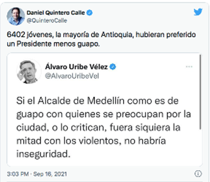 Frente a estos mensajes, el Alcalde Quintero le recordó al exmandatario que no era necesario ser más guapo si los 6402 jóvenes aún estuvieran vivos, haciendo una clara referencia a los falsos positivos de los que presuntamente el expresidente es culpable.
