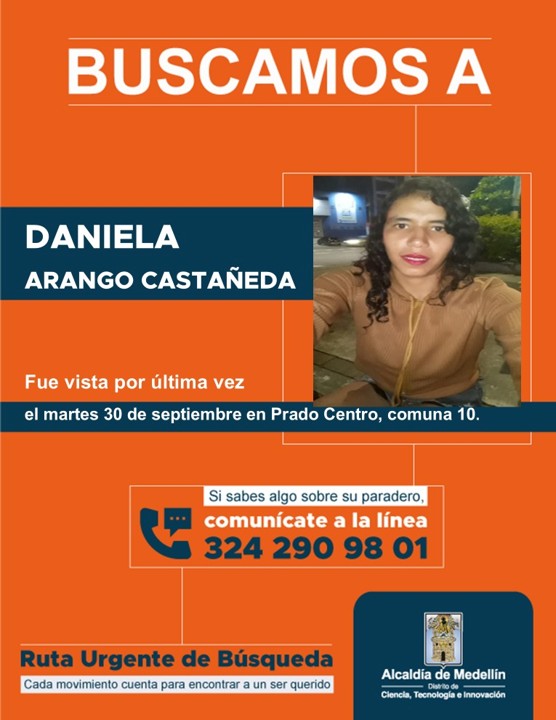 Si usted tiene cualquier información sobre el paradero de Daniela Arango Castaño, por favor, comuníquese de inmediato con las autoridades al celular 3242909801.