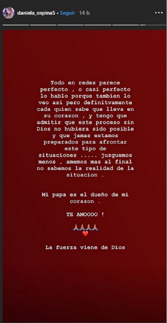 En la siguientes historias Daniela mostró cómo ganó el equipo colombiano y al final la modelo y empresaria hizo una reflexión sobre el difícil momento que está pasando debido al desfavorable estado de salud de su padre Hernán Ospina. “Tengo que admitir que este proceso sin Dios no hubiera sido posible y que jamás estamos preparados para afrontar este tipo de situaciones… Mi papá es el dueño de mi corazón”, publicó Ospina.