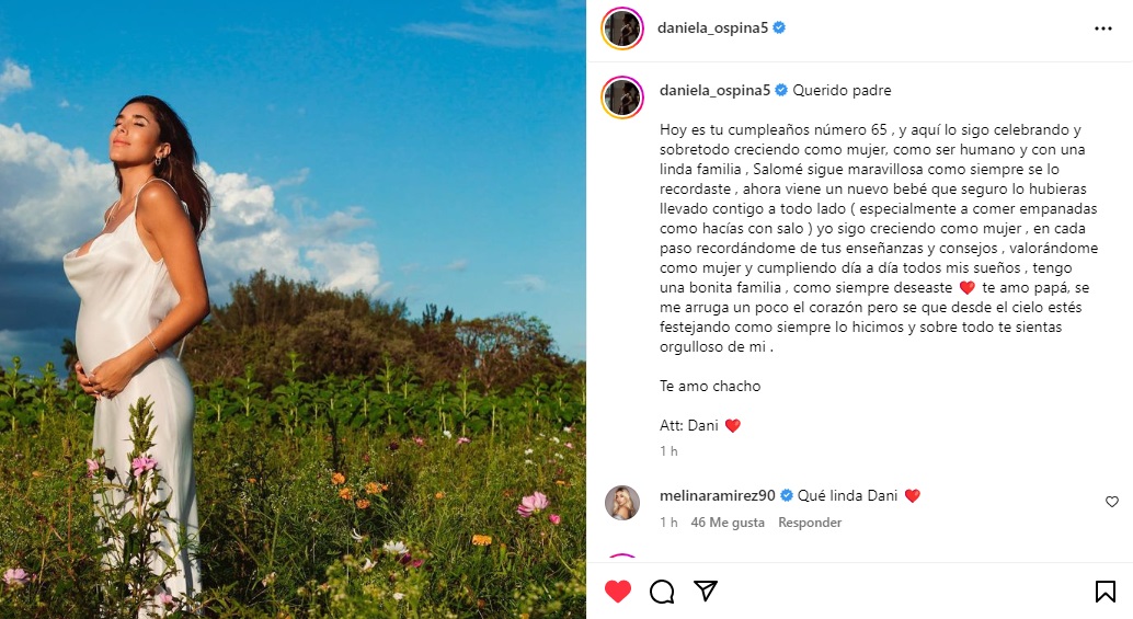 En su cuenta de Instagram, Daniela Ospina acompañó el bello mensaje, el cual es como una “carta al cielo”, de una preciosa foto de ella, donde vestida de blanco resalta su vientre, como quien le presenta a su bebé y honra su vida, hecho divino, que le debe a su padre, que se fue, pero que siempre vivirá en ella.