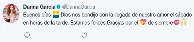 Minuto30.com .- La actriz colombiana Danna García se encuentra feliz desde que el pasado 8 de julio diera a luz a su primogénito Dante. Así lo hizo saber en su cuenta oficial de twitter.