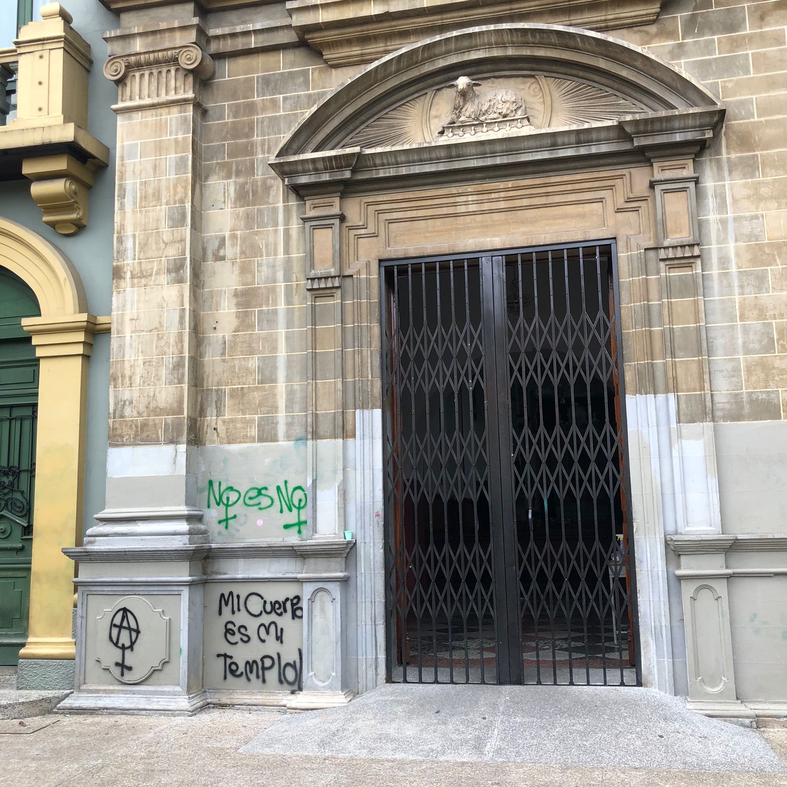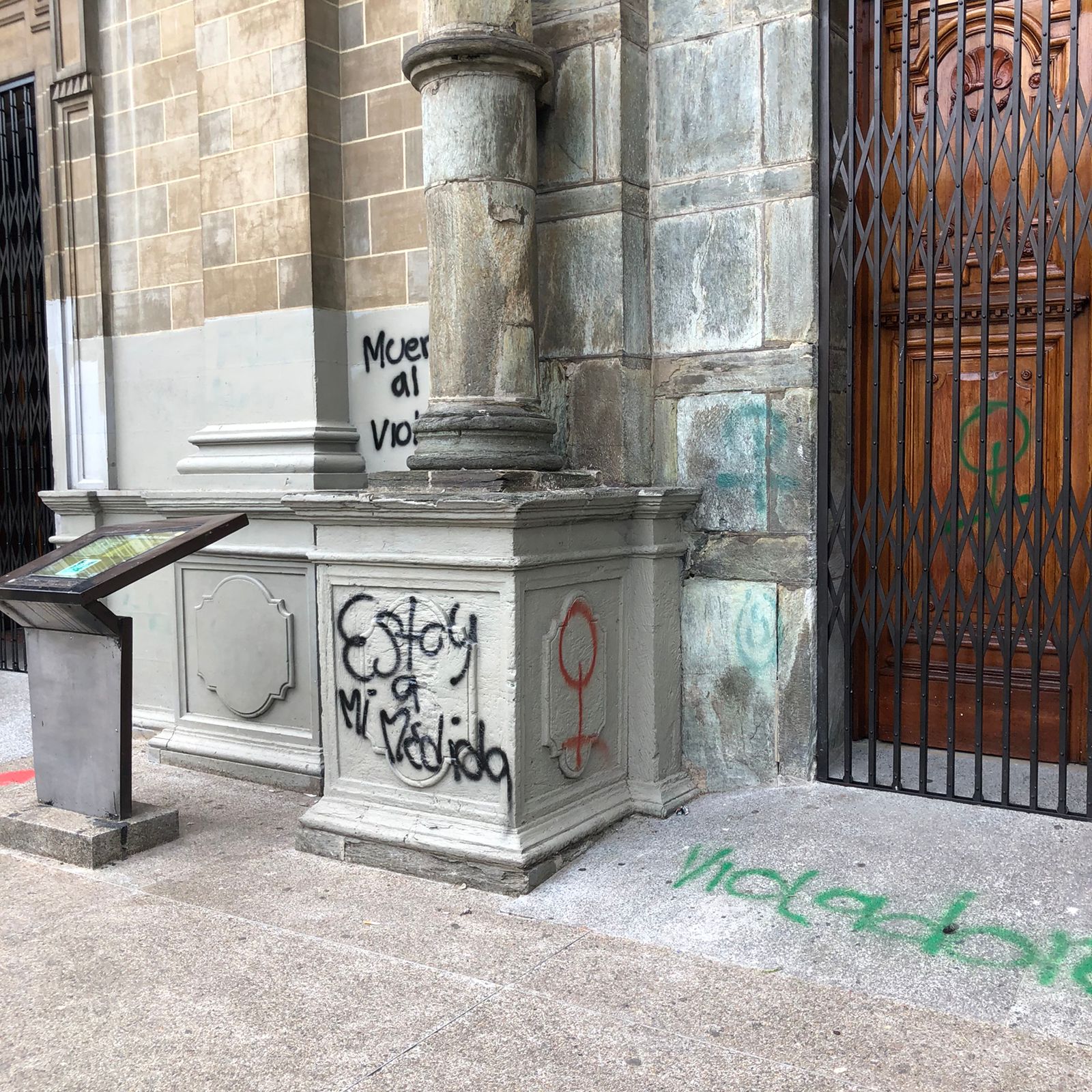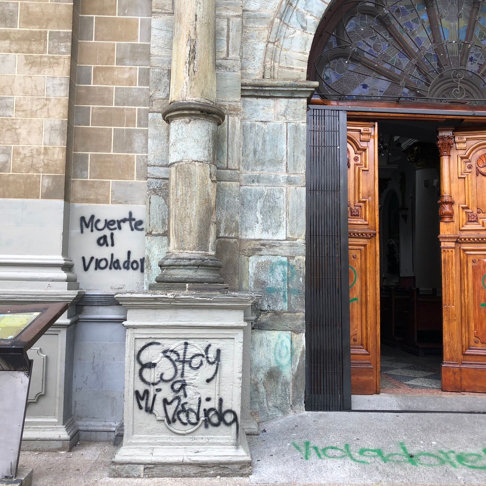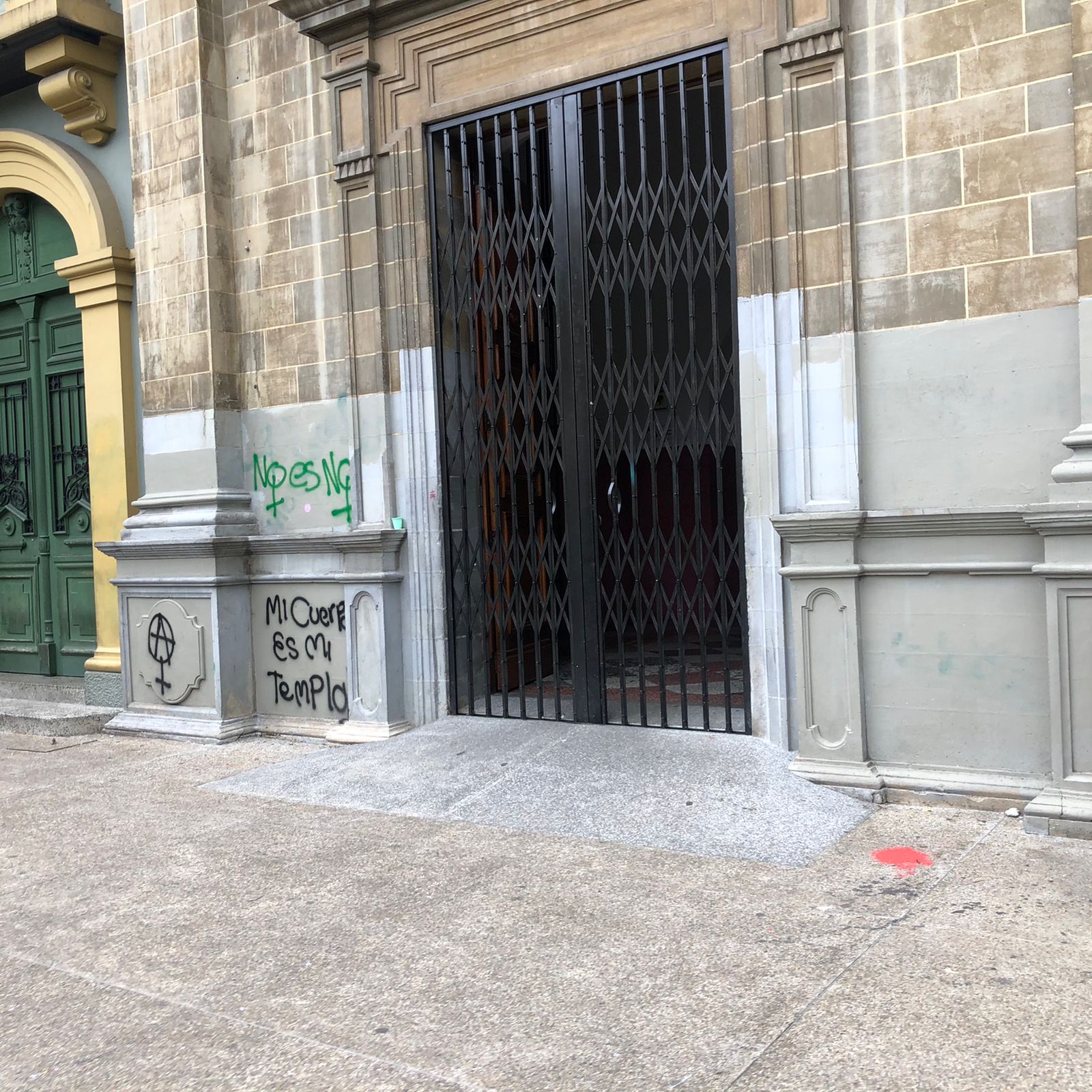 ‘Grafitearon’ la paredes y puertas de la parroquia y sin respeto alguno; en diálogo con el Párroco Guillermo León Zuleta, contó que hasta hace poco habían terminado de reparar los daños causados en protestas anteriores y ya volvieron a dañar la fachada de la Iglesia.