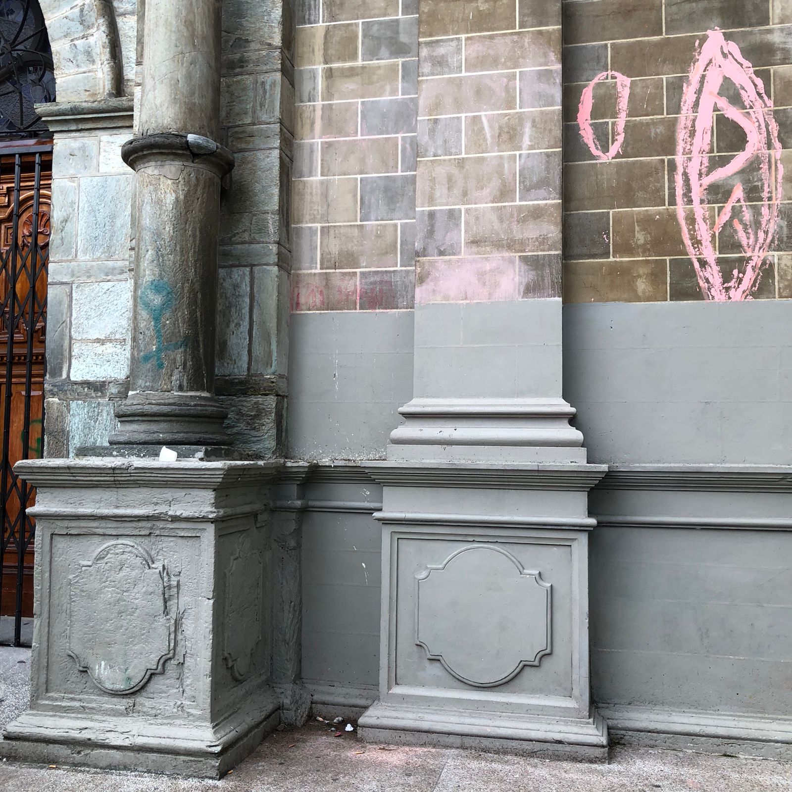Fotografías dan cuenta de los destrozos ocasionados en la fachada de la parroquia San Ignacio de Loyola en Medellín.