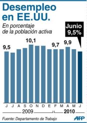 El mercado de empleo en Estados Unidos registró uno de sus peores meses en junio, con 125.000 destrucciones netas de puestos, aunque de todas maneras la tasa de desempleo retrocedió para situarse en 9,5%, datos que añaden más pesimismo a una recuperación de la economía.