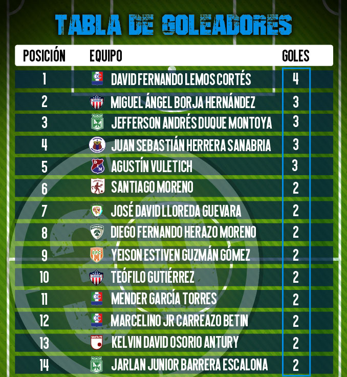 También aparecen con tres dianas: Jefferson Duque, de Atlético Nacional; Juan Sebastián Herrera, de Deportivo Pasto; y Agustín Vuletich, del Deportivo Independiente Medellín.