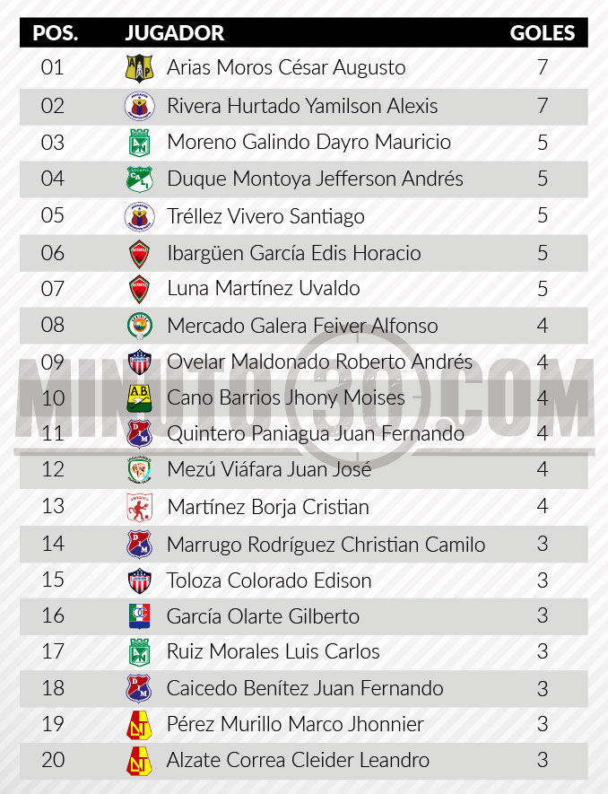 Entre tanto, Dayro Moreno, a pesar de que lleva varias jornadas sin marcar, no pierde de vista al líder del escalafón, del que lo separan solo dos anotaciones.