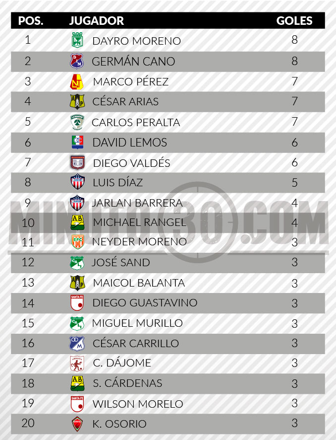 A los delanteros de los equipos antioqueños los escoltan Marco Pérez, de Deportes Tolima; César Arias, de Alianza Petrolera; y Carlos Peralta, de La Equidad; cada uno de ellos con siete anotaciones.