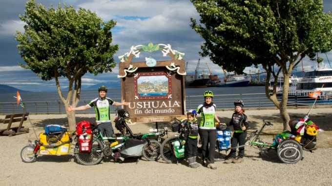 Alberta Spinazze, Sebastien Bellet y sus pequeñas hijas Ángela de 10 años y Anna de 8 años forman parte de una familia italiana que hace un par de años decidió dejar su país para embarcarse en una aventura en bicicleta por América Latina.