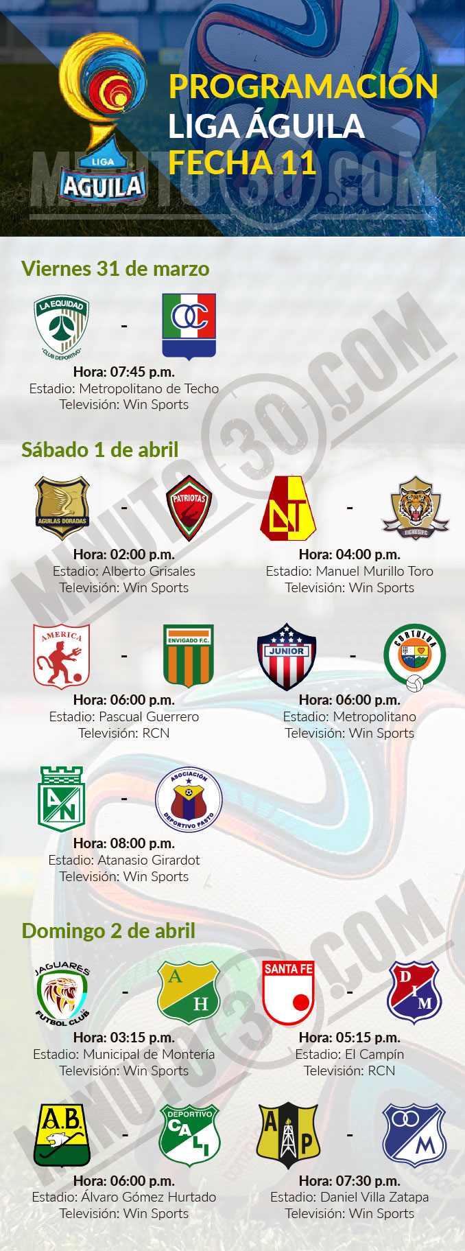 La Dimayor dio a conocer este martes la programación de la fecha 11 de la Liga Águila I-2017, que se cumplirá entre el viernes 31 de marzo y el domingo 2 de abril.