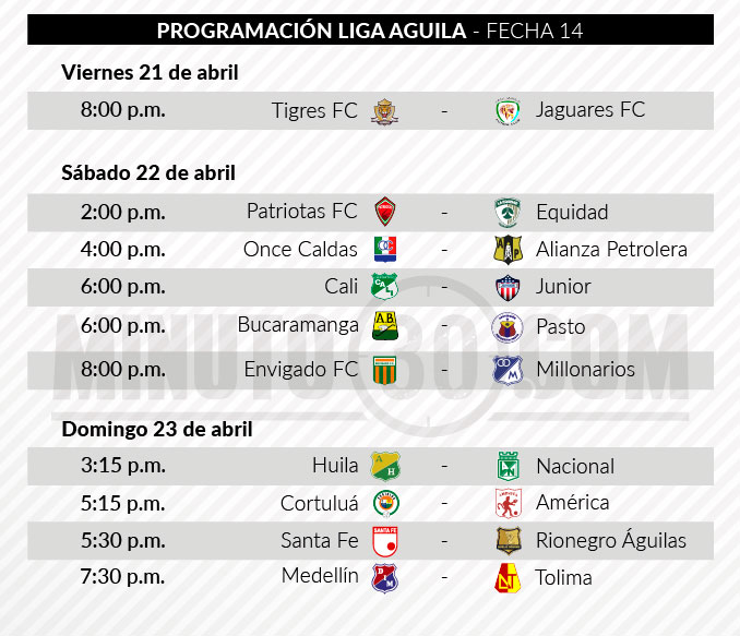 La Dimayor definió la programación de la fecha 14 de la Liga Águila, que se disputará entre el viernes 21 y el domingo 23 de abril.